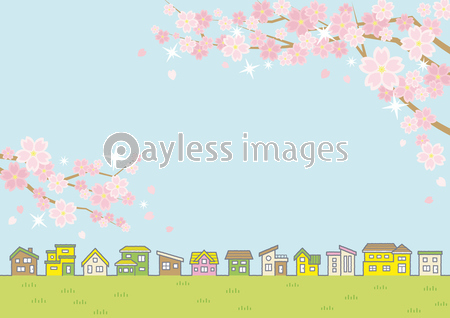 桜のある春の田舎の風景のイラスト 家の並びと空と草原 横長の書式で横書き用 ストックフォトの定額制ペイレスイメージズ